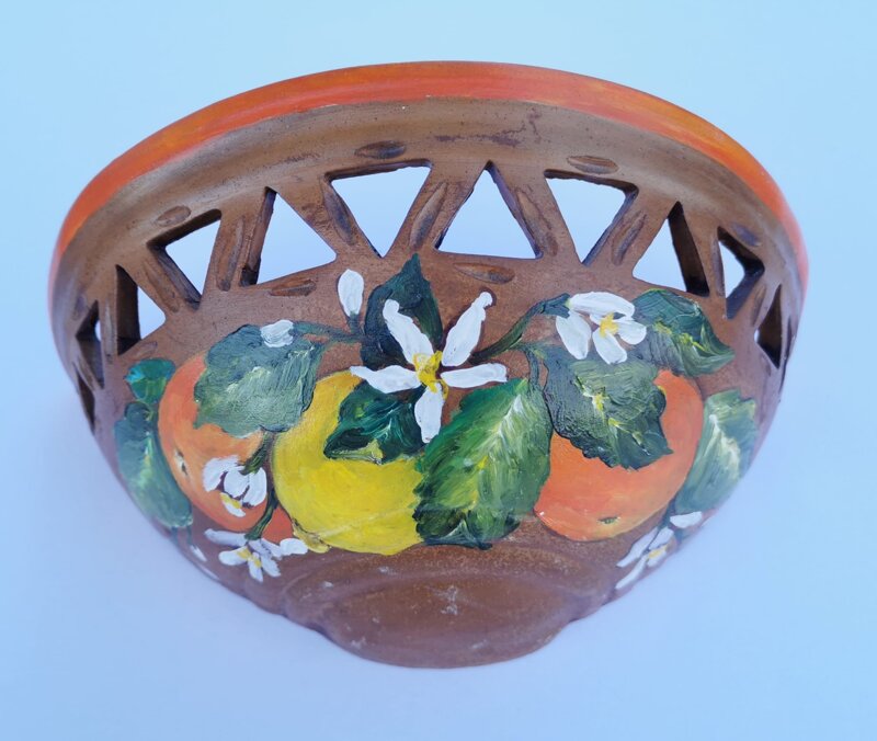 Gerla da muro traforata in terracotta decorata ad olio